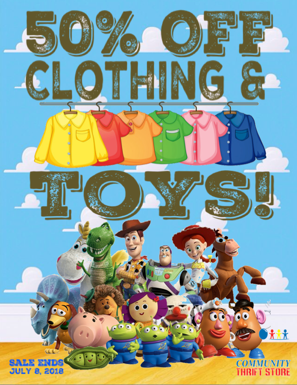 July 3 – July 8, 2018 July 3, 2018Community Thrift Store To infinity and beyond!! Hurry in for 50% OFF Clothing & Toys! Sale ends July 8, 2018! Share this: Click to share on X (Opens in new window) X Click to share on Facebook (Opens in new window) Facebook Like Loading... Related
