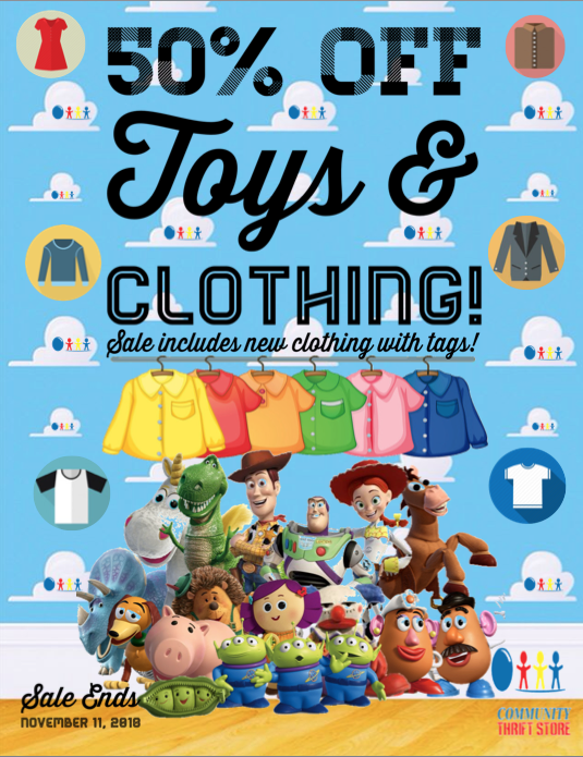 Something for you, something for the kids! Enjoy 50% off all Toys and Clothing (psssst! – even NEW clothing with tags!). Sale ends November 11, 2018.