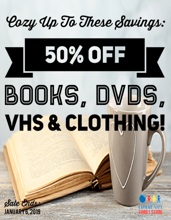 Dec. 31 – Jan. 6, 2019 December 31, 2018Community Thrift Store Start the new year off right with some cozy ME-TIME!! Save 50% off Books, DVDs, VHS & Clothing! Sale ends January 6, 2019. Share this: Click to share on X (Opens in new window) X Click to share on Facebook (Opens in new window) Facebook Like Loading... Related