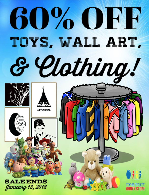Something for you, something for the kids, and even something for your walls! Come in for 60% off Clothing, Toys and Wall Art! Sale ends January 13, 2019.