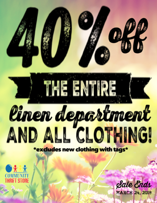 Mar. 18 – Mar. 24, 2019 March 18, 2019March 16, 2019Community Thrift Store Spring is in the air! Come in an enjoy 40% off our entire linen department and all clothing too!! Sale ends March 24, 2019. Share this: Click to share on X (Opens in new window) X Click to share on Facebook (Opens in new window) Facebook Like Loading... Related