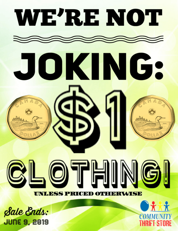 June 3 – June 9, 2019 June 3, 2019June 2, 2019Community Thrift Store HOLY MOLY! We’re NOT joking! $1 CLOTHING SALE! Sale includes ALL clothing unless priced otherwise. Sale ends June 9, 2019. Share this: Click to share on X (Opens in new window) X Click to share on Facebook (Opens in new window) Facebook Like Loading... Related