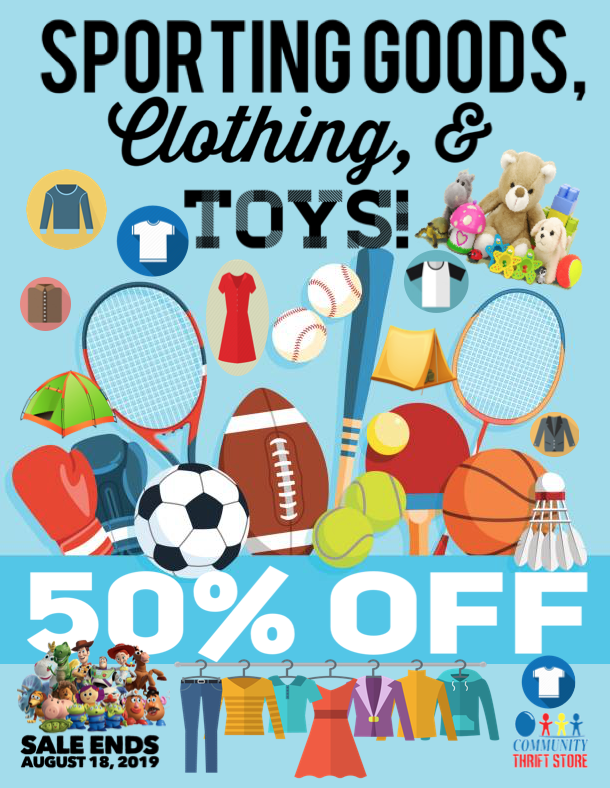 Aug. 12 – Aug. 18, 2019 August 12, 2019August 10, 2019Community Thrift Store Make the most of the remaining summer days! Come in for 50% off Sporting Goods, Clothing & Toys! Sale ends August 18, 2019. Share this: Share on X (Opens in new window) X Share on Facebook (Opens in new window) Facebook Like Loading... Related