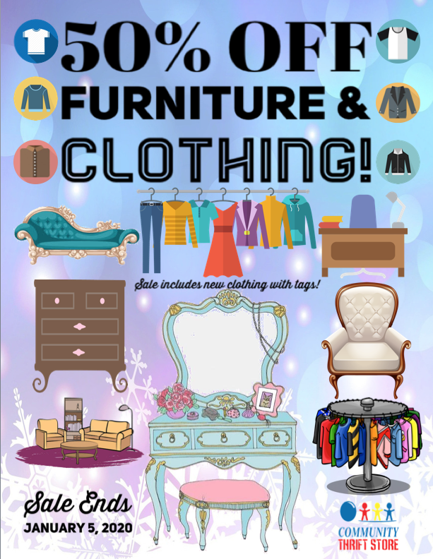 New Year, New You! Start 2020 off right with a fresh wardrobe and a home makeover! Come in for our 50% off Clothing & Furniture sale which includes new clothing with tags! Sale ends January 5th, 2020.