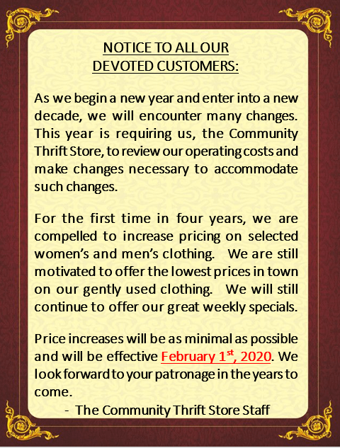 A Notice to Our Devoted Customers . . . January 8, 2020Community Thrift Store Share this: Click to share on X (Opens in new window) X Click to share on Facebook (Opens in new window) Facebook Like Loading... Related