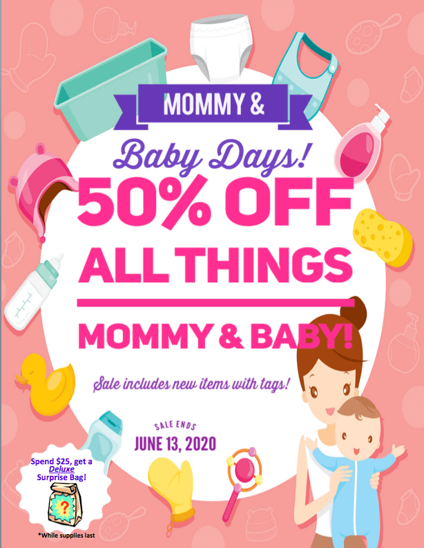 Mommy & Baby Days are here!! Take a whopping 50% OFF all things Mommy & Baby! Sale includes new items with tags and ends on June 13th, 2020!