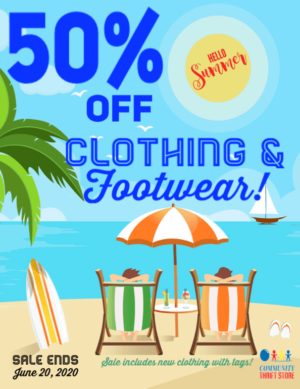 Update your summer wardrobe with our SIZZLIN’ SUMMER SALE! Save 50% off all Clothing & Footwear! Sale includes new clothing with tags and ends on June 20th, 2020.