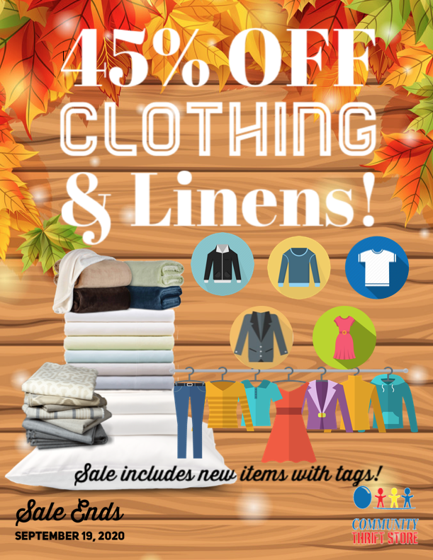New season, new YOU!! Time to rotate your linens & wardrobe with a fresh look! We’ll help with 45% off Clothing & Linens! Sale includes NEW items with tags and ends September 19, 2020.