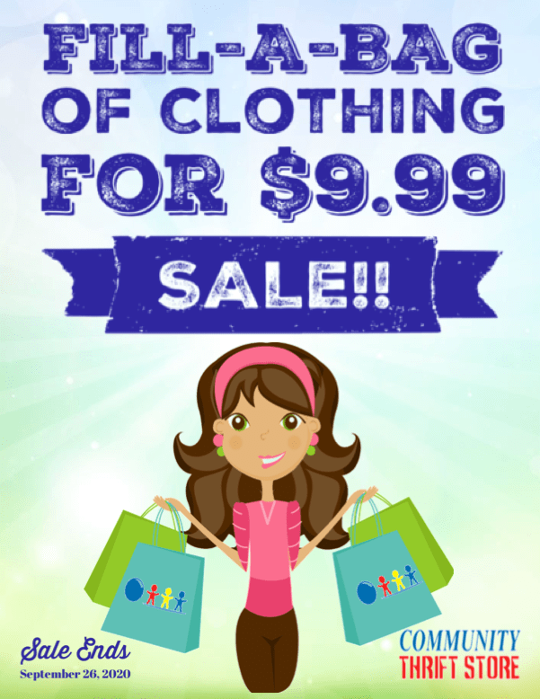 Back by popular demand, this week we’re featuring our customer favourite: the FILL-A-BAG OF CLOTHING SALE for $9.99!! That’s right – a FULL BAG for just $9.99!! No wonder our customers love this sale! Get yourself a full, new-to-you wardrobe for less than the price of coffee for a week!! Hurry in – this long-awaited sale ends September 26, 2020 and excludes new clothing with tags.