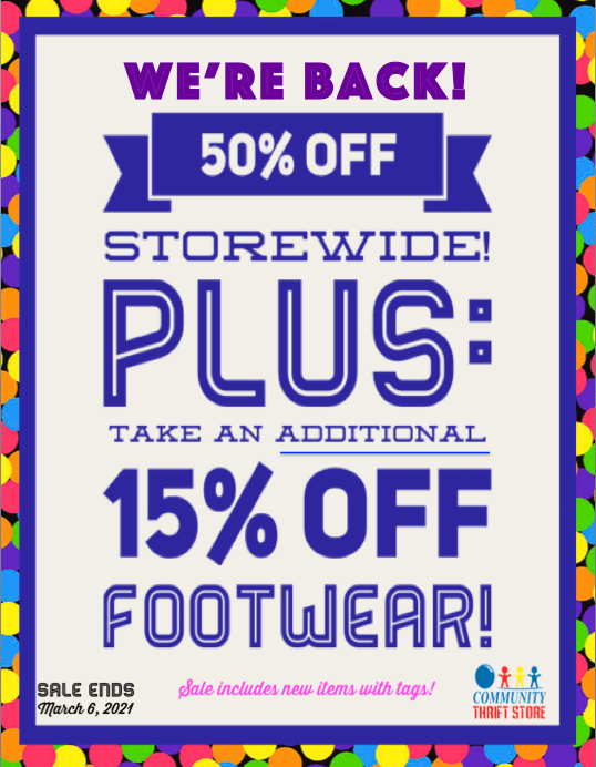 We’re BACK and we’ve MISSED YOU! To celebrate our re-opening, we’re giving you a whopping 50% OFF STOREWIDE! But that’s not all – we’re tossing an ADDITIONAL 15% OFF on ALL FOOTWEAR! We can’t wait to see & serve you! Hurry in for best selection. Sale includes new items with tags and ends March 6th, 2021.