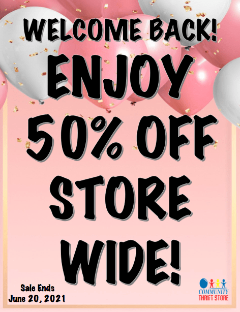Welcome Back!! We have missed YOU! We’ve got something special in-store for you all – enjoy 50% OFF STOREWIDE! We can’t wait to see you! Sale includes new items with tags and ends June 20th, 2021! Hurry in – we’ve got some treasures waiting for YOU!!