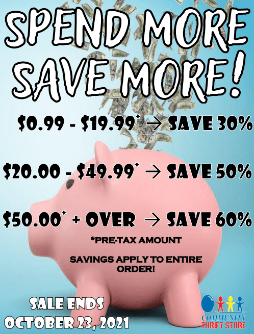 Oct. 18-23, 2021 October 17, 2021October 17, 2021Community Thrift Store Our SPEND MORE, SAVE MORE event is ON!! Join us October 18th to 23rd and save BIG on all your purchases!! Run, don’t walk, for the BEST SELECTION! We can’t wait to see you! Share this: Click to share on X (Opens in new window) X Click to share on Facebook (Opens in new window) Facebook Like Loading... Related