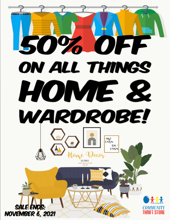 Nov. 1-6, 2021 October 31, 2021October 24, 2021Community Thrift Store Give your home & wardrobe some love this week! Save 50% off all things for your home and update your closet – just in time for cooler weather! Sale ends November 6, 2021. Share this: Click to share on X (Opens in new window) X Click to share on Facebook (Opens in new window) Facebook Like Loading... Related