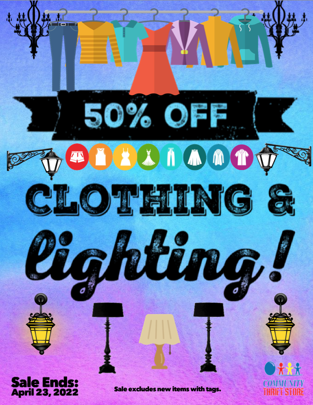 Check out this week’s sale that is sure to BRIGHTEN your day! Enjoy 50% OFF Clothing & Lighting! Sale excludes new items with tags and ends April 23rd, 2022.