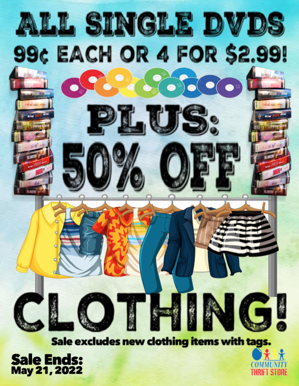 Catch up on all the best flicks in the comfort of your own home! Come in this week where ALL Single DVDs are just 99¢ OR 4 for $2.99!! PLUS: Take 50% OFF Clothing!! Sale excludes new clothing items with tags and ends May 21, 2022.