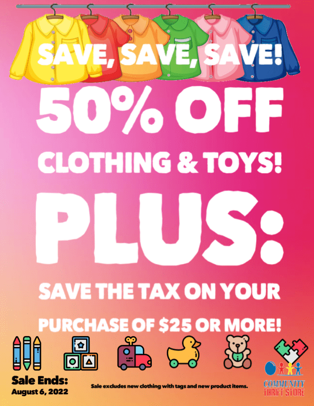 SAVE! SAVE! SAVE! So many ways to save at CTS! August 2nd – 6th, take 50% OFF Clothing & Toys. PLUS: SAVE THE TAX ON YOUR PURCHASE OF $25 OR MORE – keeping more of your hard-earned money in your pockets! Sale excludes new items with tags and new product items and ends August 6th, 2022.