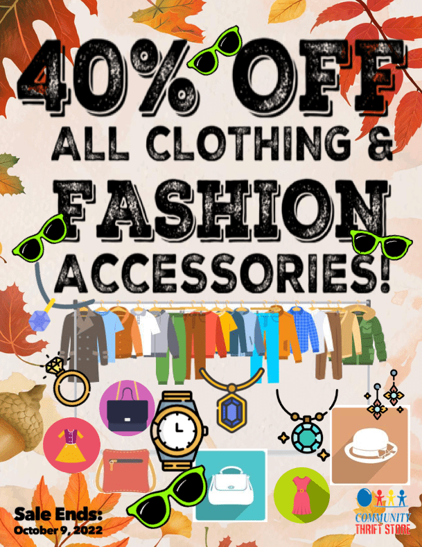Time to dress up in your 🍁Fall Best🍂 or dress down in your 👕comfy-cozies👚 and enjoy this sweater weather! This week, take 40% OFF all clothing & 💍🎩fashion accessories👛👓! Sale ends October 9th, 2022.
