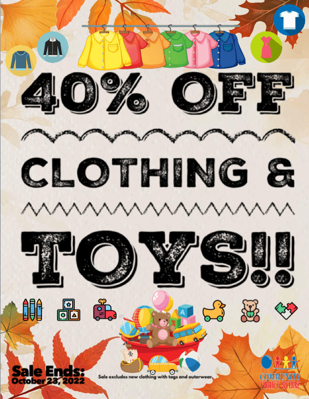 Pick-up a few new pieces to keep you warm this week, and while you’re at it, grab a few toys for the kids in your life! This week, take 40% OFF 👗CLOTHING👕 & 🥁TOYS🎲! Sale excludes new clothing with tags, outerwear and ends on October 23rd, 2022.