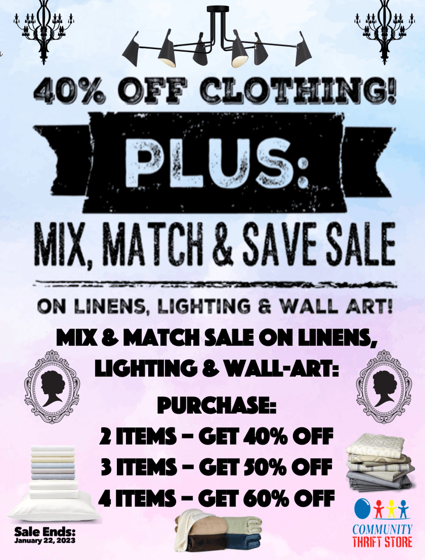 We have a doozy of a sale for you! This week, take 40% OFF Clothing! ๐ PLUS: Enjoy our Mix, Match & Save Sale on Linens ๐, Lighting๐ก& Wall-Art ๐ผ! Purchase 2 items from these departments, take ๐ฅ40% OFF!๐ฅ Purchase 3 items, get ๐ฅ50% OFF๐ฅ, and if you purchase 4 items, you get a WHOPPING ๐ฅ60% OFF๐ฅ!! Hurry in, sale ends January 22, 2023. ๐ฅณ