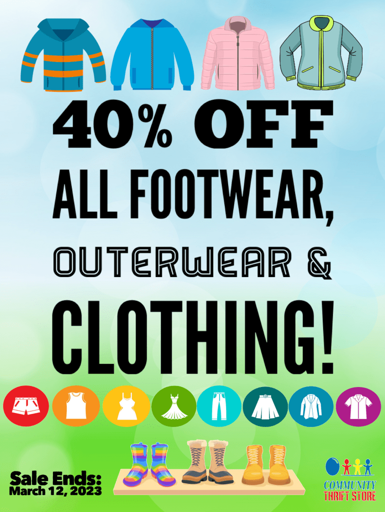 Get your self decked out from head to toe in a new-to-you outfit! Come in this week to enjoy 40% OFF all FOOTWEAR 👟, OUTERWEAR 🧥 & CLOTHING 👚! Hurry in, sale ends March 12, 2023.