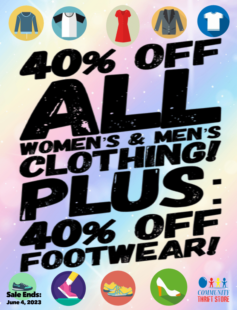 Time to update your wardrobe with all new pieces…and at a great price, no less!! This week, take 💥40% OFF💥ALL 👗Women’s & Men’s Clothing👕! PLUS: Take 🥾40% OFF Footwear👠!! Hurry in – sale ends June 4th, 2023!!