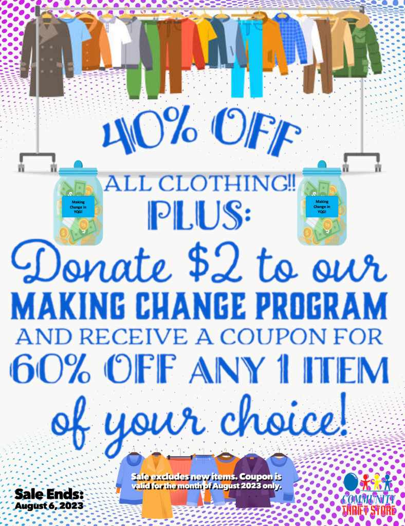 Good things happen when you help others!😊 This week, take 👚40% OFF Clothing! 👕 PLUS: Donate $2 to our 💰Making Change Program💰 and receive a Coupon for 🏷60% OFF 🏷any 1 item of your choice! Sale excludes new items and ends on August 6th, 2023. The 60% OFF Coupon is valid for use on a future purchase in August 2023 only.
