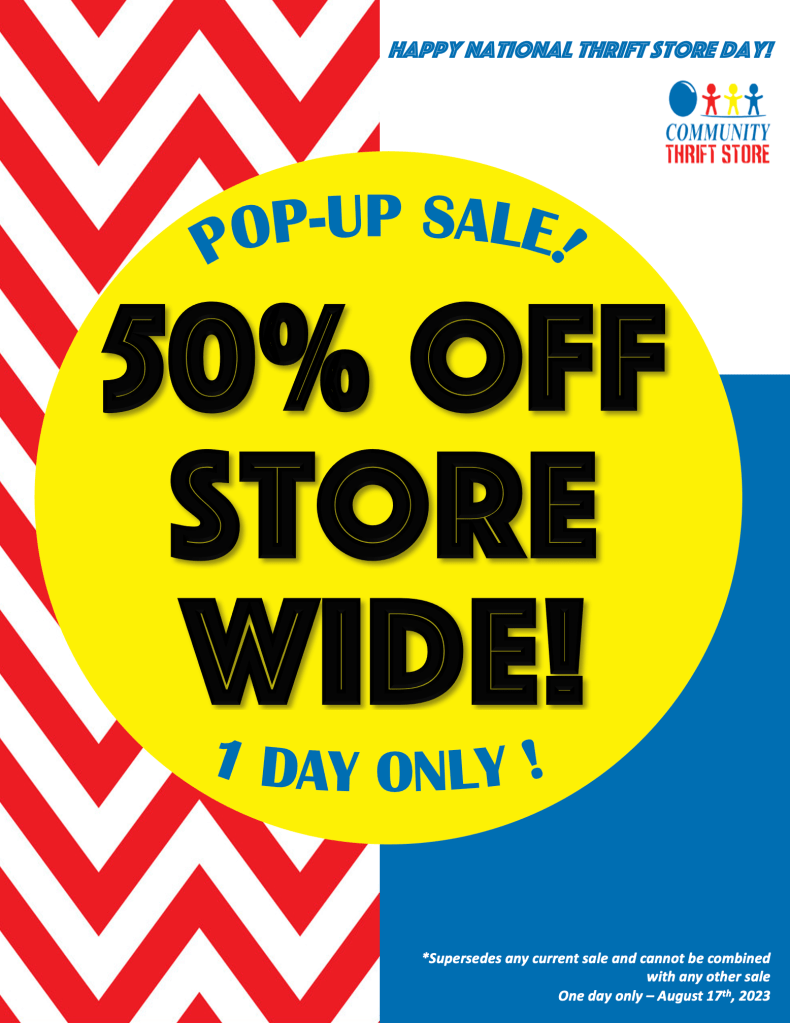 🎈Happy National Thrift Store Day!🎈 To celebrate, we’re offering our fabulous customers a 🚨POP-UP SALE for ONE DAY ONLY🚨!! On Thursday August 17th – enjoy 🥳50% OFF STOREWIDE!!🥳. This sale supersedes any current sale, cannot be combined with any other sale, and ends at 6:00pm on Thursday August 17th, 2023.