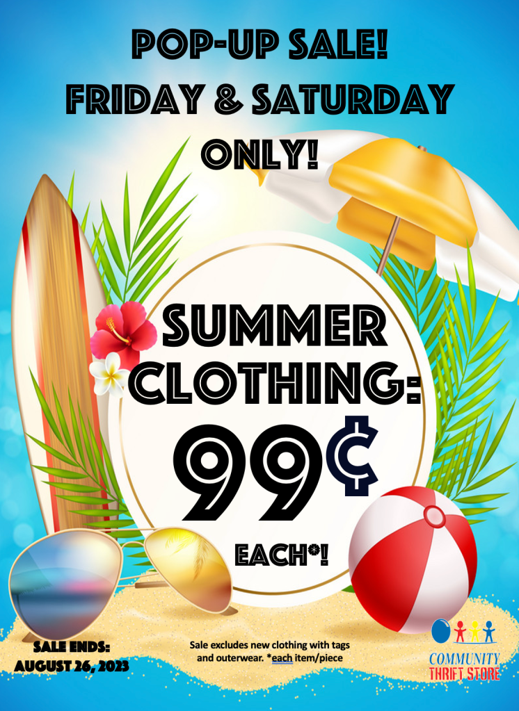 🚨POP-UP SALE! TWO-DAYS ONLY!🚨 Friday and Saturday ONLY, 🩱👕ALL SUMMER CLOTHING 🩳👙 WILL BE 99¢ EACH PIECE/ITEM! 🔥You read that right – JUST 99¢ EACH!🔥 Sale ends Saturday August 26th and excludes outerwear and new items with tags!