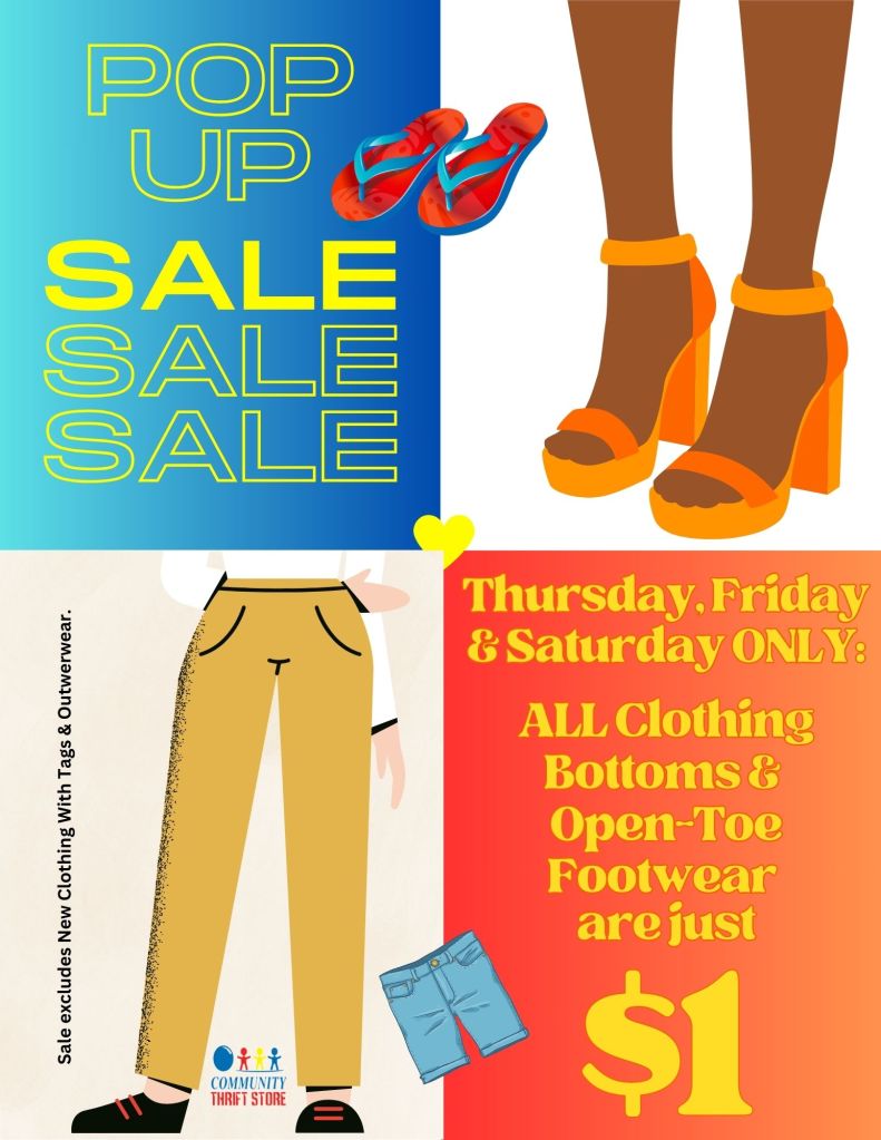 📣🚨📣POP-UP SALE!📣🚨📣Thursday, Friday & Saturday ONLY!! ALL👖Clothing Bottoms 🩳 & 🩴 Open-Toe Footwear 👡are just $1! That’s right – just ONE DOLLAR! Sale excludes new clothing with tags and outerwear and ends on September 9th, 2023!