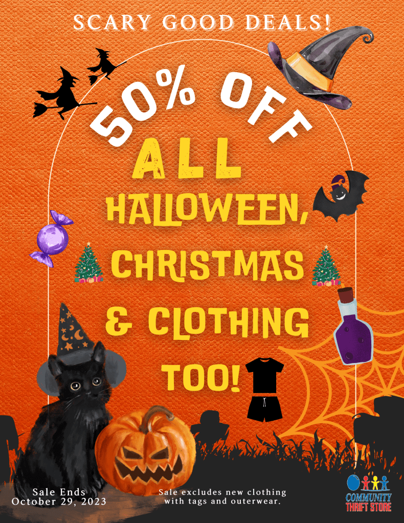🧟♂️ Looking for some scary good deals? 👻Come in this week for some SPOOKTACULAR savings! 👻 50% OFF everything 🎃Halloween,🎄Christmas, and 👕Clothing too!! Sale excludes new clothing with tags and outerwear and ends on October 29th, 2023.