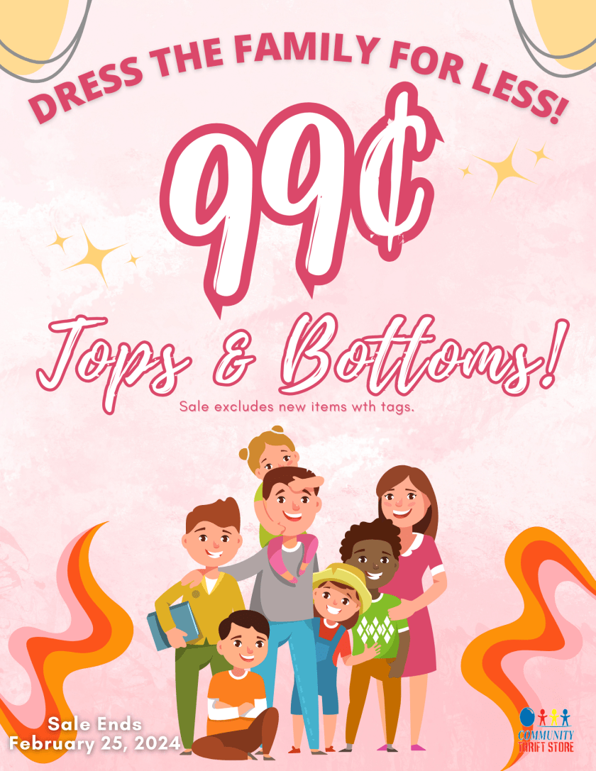 🎉 Looking to upgrade your family’s wardrobe without breaking the bank?💰We’ve got you covered! This week, grab stylish 👚tops and bottoms👖for just 99 CENTS each! 😍✨ From trendy tees to cozy bottoms, we’ve got something for everyBODY in the family! Sale excludes new items with tags and ends February 25, 2024. 🎉