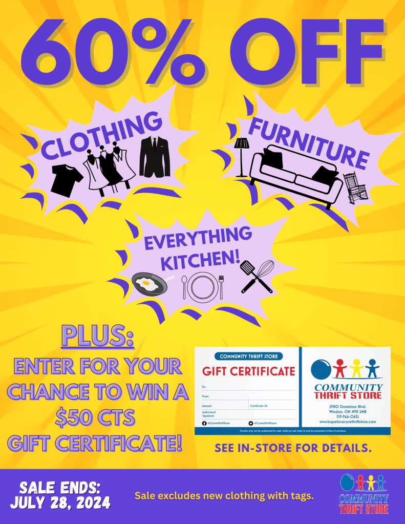 This week, take 💥60% OFF💥 Clothing👕, Furniture🪑, & Everything Kitchen 🍽! 🥳 PLUS: Enter for your chance to win a 💥$50 CTS Gift Certificate💥! See in-store for details! Sale excludes new clothing with tags and ends on July 28th, 2024.