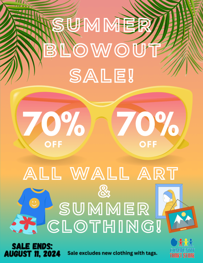 📣Join us for a ☀️SUMMER BLOWOUT☀️ event! Enjoy a whopping 💥70% OFF💥 Summer Clothing and Wall Art! Sale excludes new clothing with tags and ends on August 11, 2024.