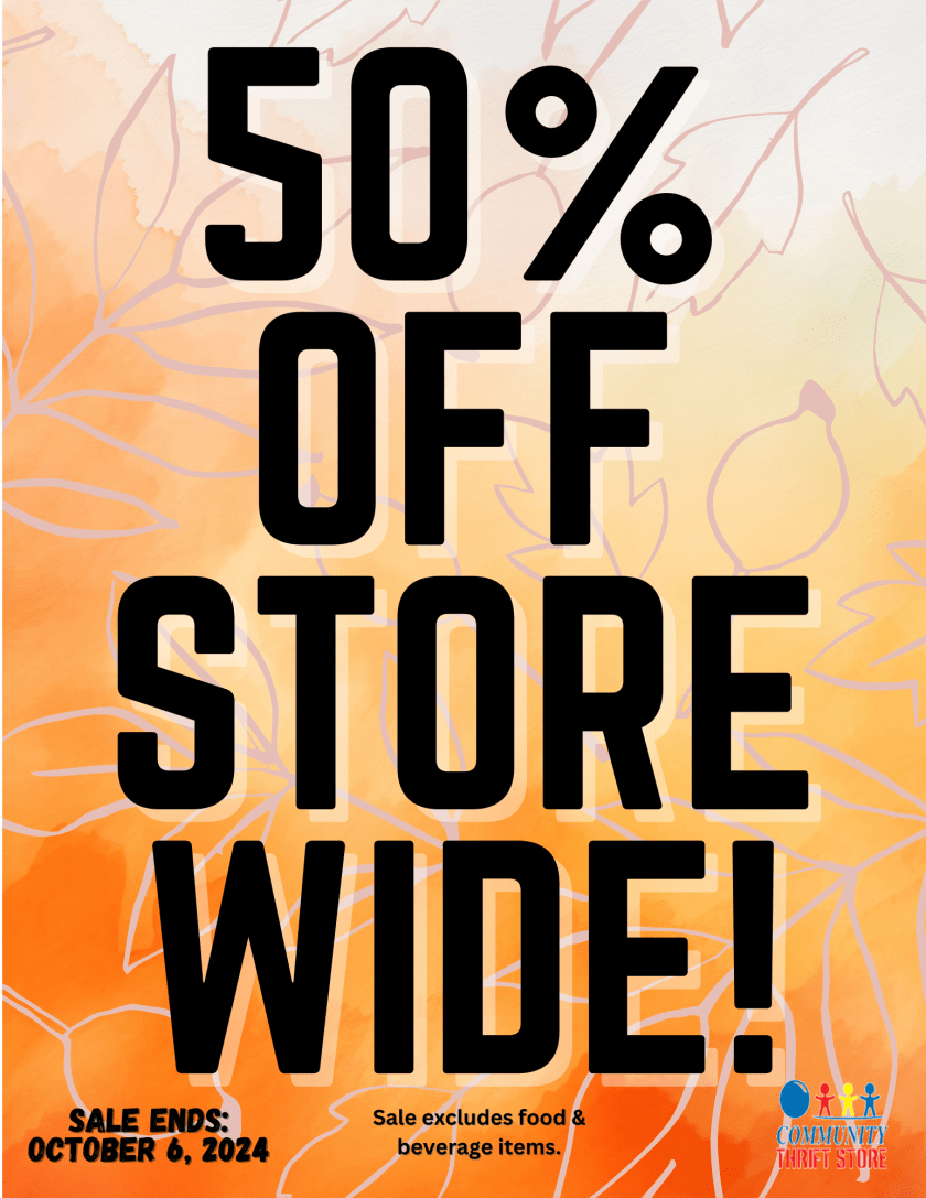 ✨🛍️ Half Off, What a Steal! Our thrift store sale that’s *so* unreal! 😲 Clothes, decor, treasures galore— 50% OFF *EVERYTHING* in store! 🎉 Hurry, don’t wait, before it’s too late! Grab your finds and celebrate! 🛒💥 Sale excludes food and beverage items, and ends on October 6th, 2024!