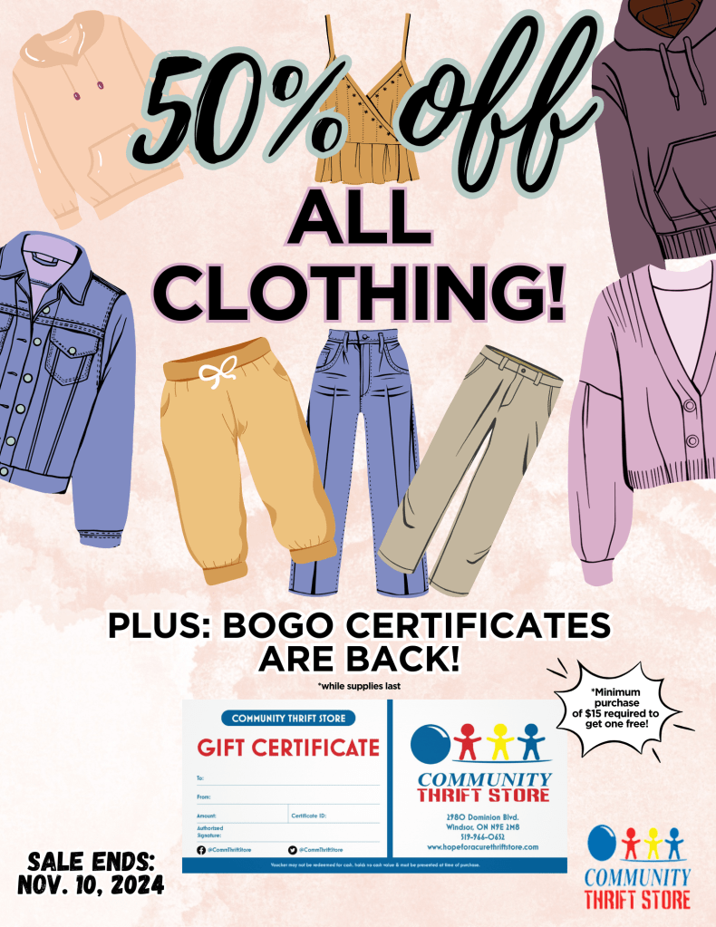 ππGrab your favourite clothing pieces at half the price! This week, take 50% OFF ALL CLOTHING!ππ PLUS: Buy one, get one certificates are back! Purchase a gift certificate (at a minimum of $15) to get one free! (*while supplies last*)! Sale ends November 10th, 2024.