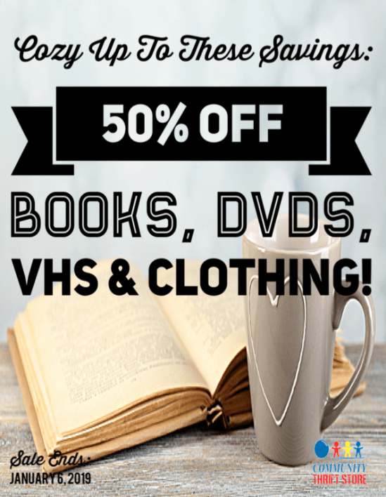 Start the new year off right with some cozy ME-TIME!! Save 50% off Books, DVDs, VHS & Clothing! Sale ends January 6, 2019.