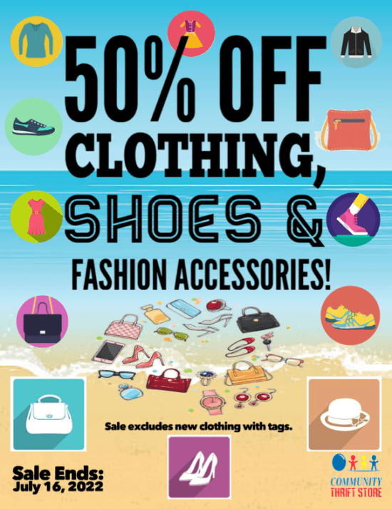 Get your wardrobe ready for those sizzling hot summer nights! We’ll help you out with 50% OFF Clothing, Shoes & Fashion Accessories to keep you looking your best!! Sale excludes new clothing with tags and ends on July 16th, 2022.