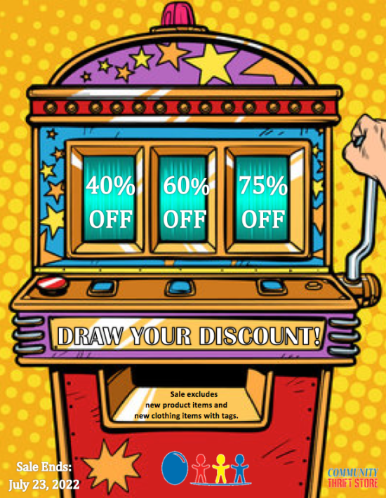 DRAW YOUR DISCOUNT DAYS ARE BACK!! Test your luck and draw 40%, 60% or even 75% OFF your entire purchase!! Sale excludes new product items and new clothing items with tags and ends on July 23rd, 2022.