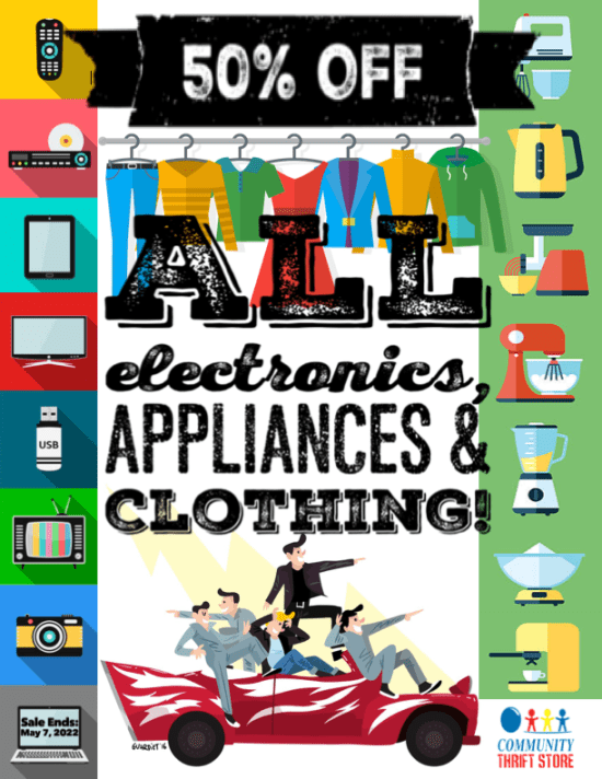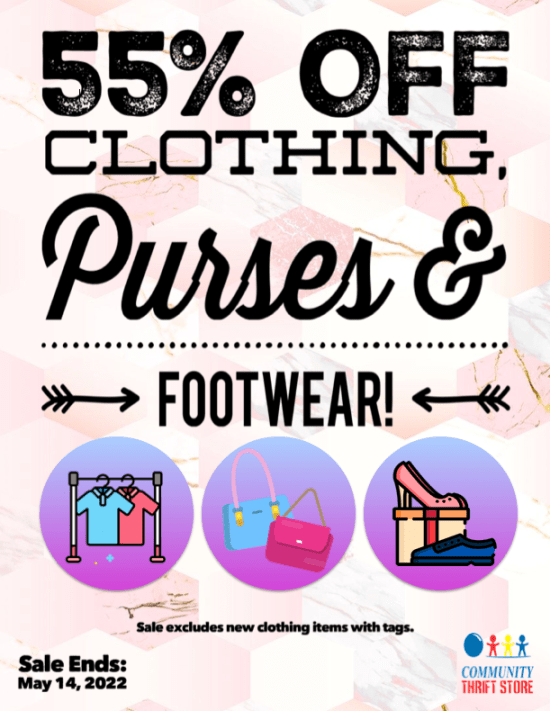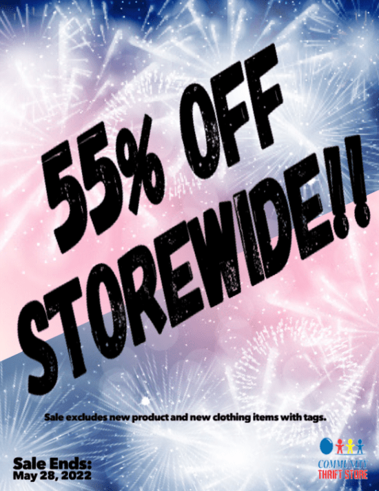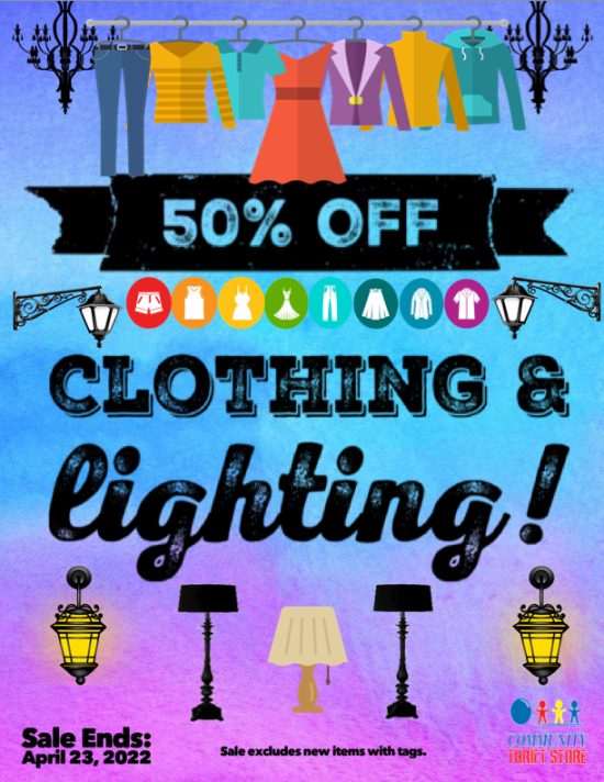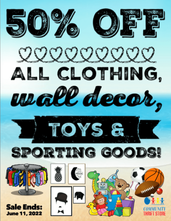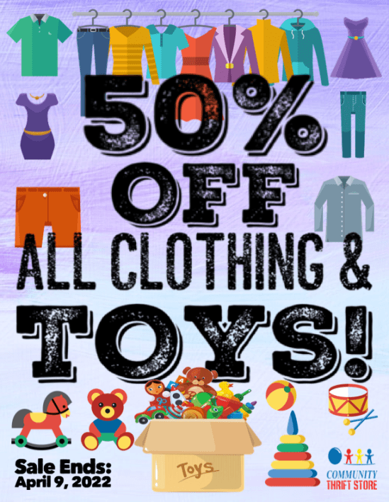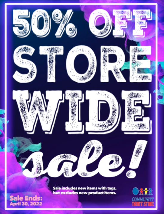 April showers โ๏ธ may bring May flowers ๐บ๐ป๐ธ, but Community Thrift Store brings you HOT, HOT SALES! ๐ฅ This week, take a whopping 50% OFF STOREWIDE!! ๐ฎ You want it, you got it, half-off!! Sale includes new items with tags, but excludes new product items. Sale ends April 30, 2022.