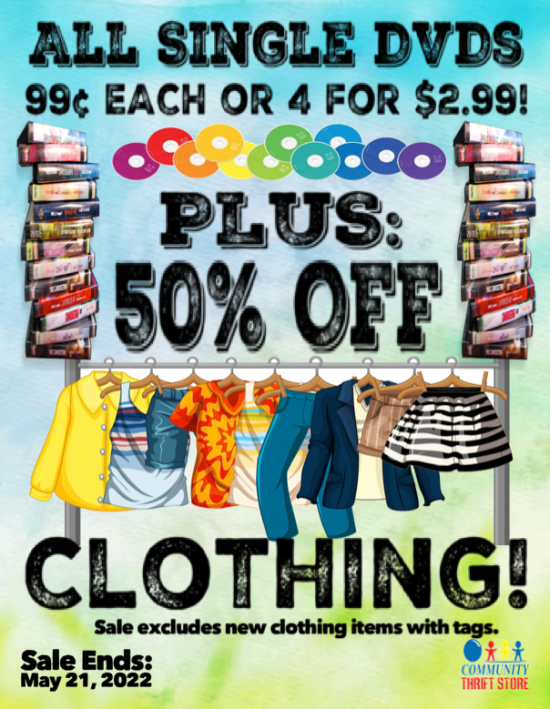 Catch up on all the best flicks in the comfort of your own home! Come in this week where ALL Single DVDs are just 99ยข OR 4 for $2.99!! PLUS: Take 50% OFF Clothing!! Sale excludes new clothing items with tags and ends May 21, 2022.