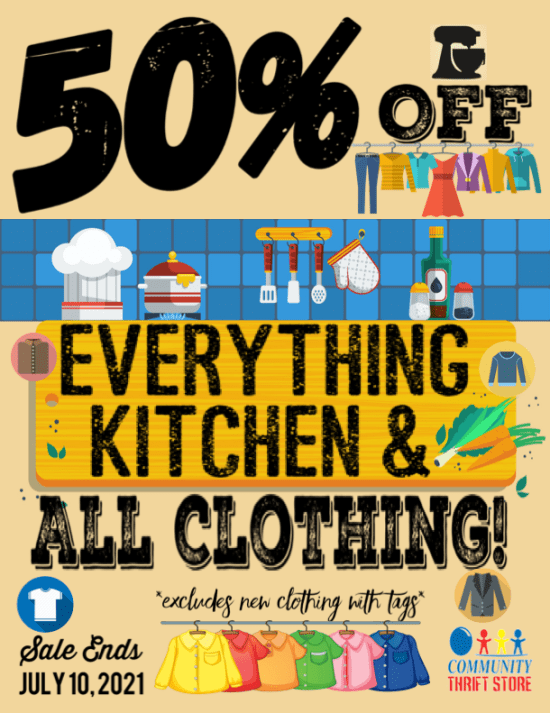 Outfit your kitchen AND your wardrobe with this sale!! Take 50% off all kitchen items and all clothing!! Sale excludes new items with tags and ends July 10, 2021.