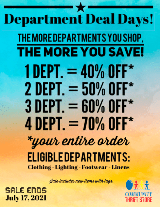 Spend more, save more with our Department Deal Days sale!! Shop eligible departments and save 40%, 50%, 60%, EVEN 70% off your entire order!! Sale includes new items with tags and ends on July 17th, 2021.