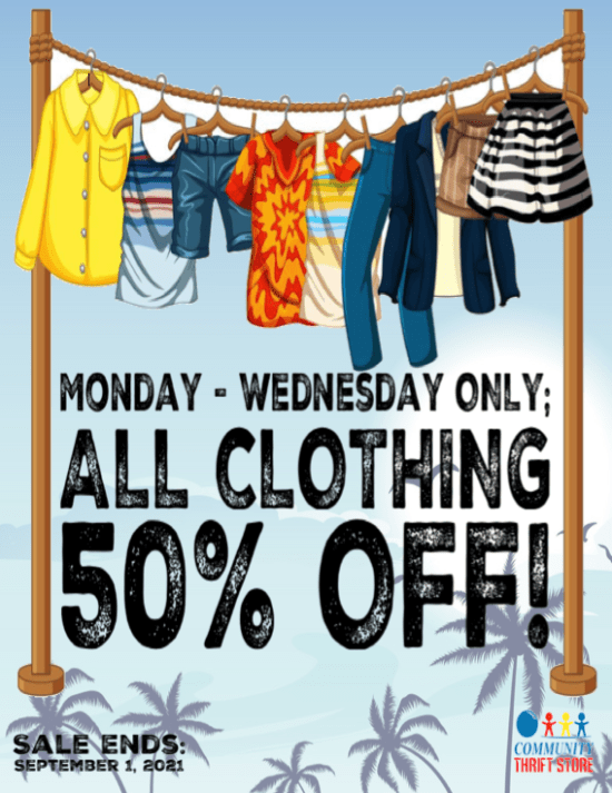 Check out this sizzlin’ hot summer sale!! Save 50% off of all clothing, sporting goods and toys!! Sale ends on July 24th, 2021.