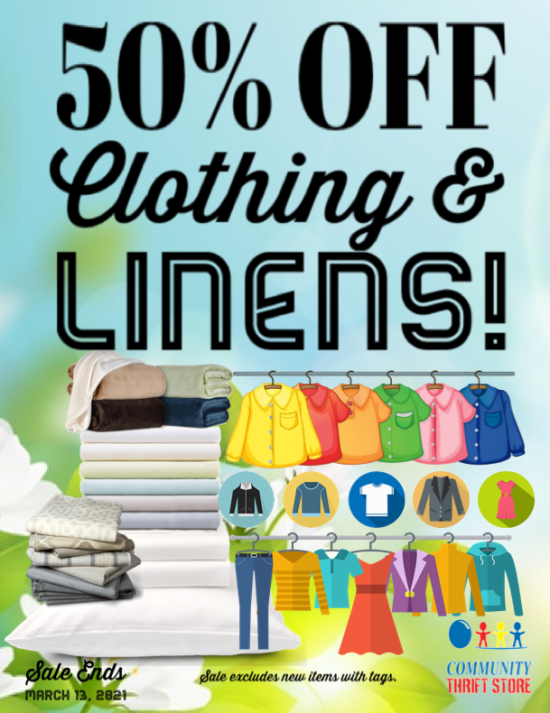 The sun is shining, the snow is melting, and the birds are singing!! SPRING into a new wardrobe and new linens for your home! This week – SAVE 50% on ALL CLOTHING & LINENS! Sale excludes new items with tags and ends March 13, 2021.