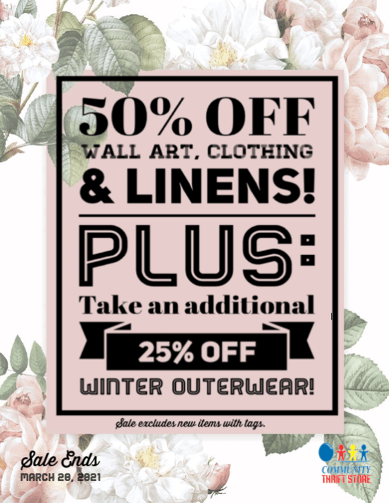 THIS IS A SALE YOU CAN’T AFFORD TO MISS!! Join us for 50% off all wall-art, clothing, and linens! PLUS – take an additional 25% off Winter Outerwear!! Sale excludes new items with tags and ends March 20, 2021.