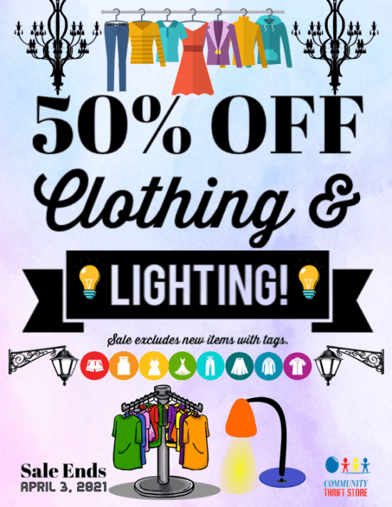 A sale so big, we need 2 weeks to run it!! Stop in this week and next for 50% off Clothing and Lighting! Brighten up your wardrobe and your home with new pieces that will leave your wallet happy!! Sale excludes new items with tags and ends on April 3rd, 2021.