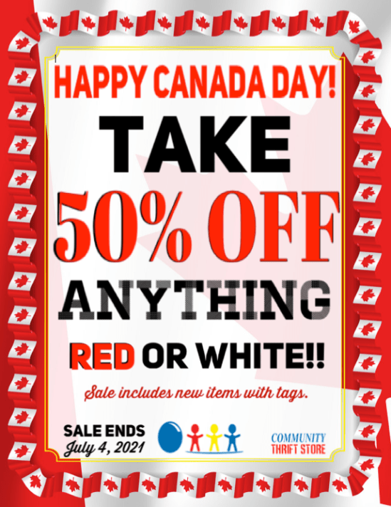 Happy Birthday, Canada!! We want to celebrate with a COLOURFUL sale!! Take 50% OFF ANYTHING RED OR WHITE in store!! Sale includes new items with tags and ends on July 4th, 2021.