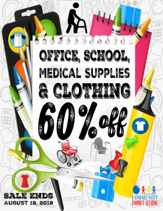 Back to school after summer break got you down? Back to work after vacation blues?! We’ll ease the pain with 60% off all School, Office, Medical Supplies and all Clothing!! Sale ends August 19, 2018.