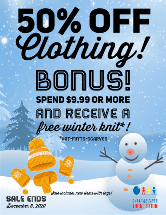 Stay warm & fashionable this winter with 50% off ALL CLOTHING! BONUS – Spend $9.99 or more and receive a FREE winter knit (while quantities last!)! Sale includes new items with tags and ends December 5th, 2020.