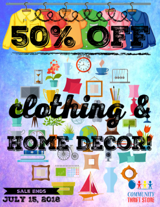 Do your wardrobe and home need an update? Come see us – we’ll save you 50% off Clothing & Home Decor! Sale ends July 15, 2018!